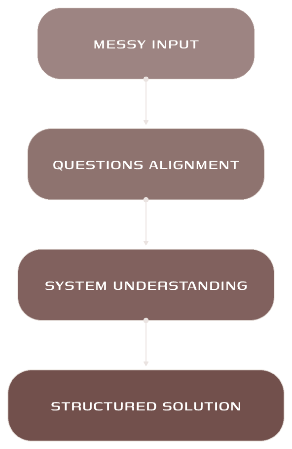 I usually start by deeply familiarising myself with the product or problem space, identifying gaps, and forming the right questions. From there, I bring people together — whether that’s product, engineering, or other teams — to align on understanding before moving into solutions.