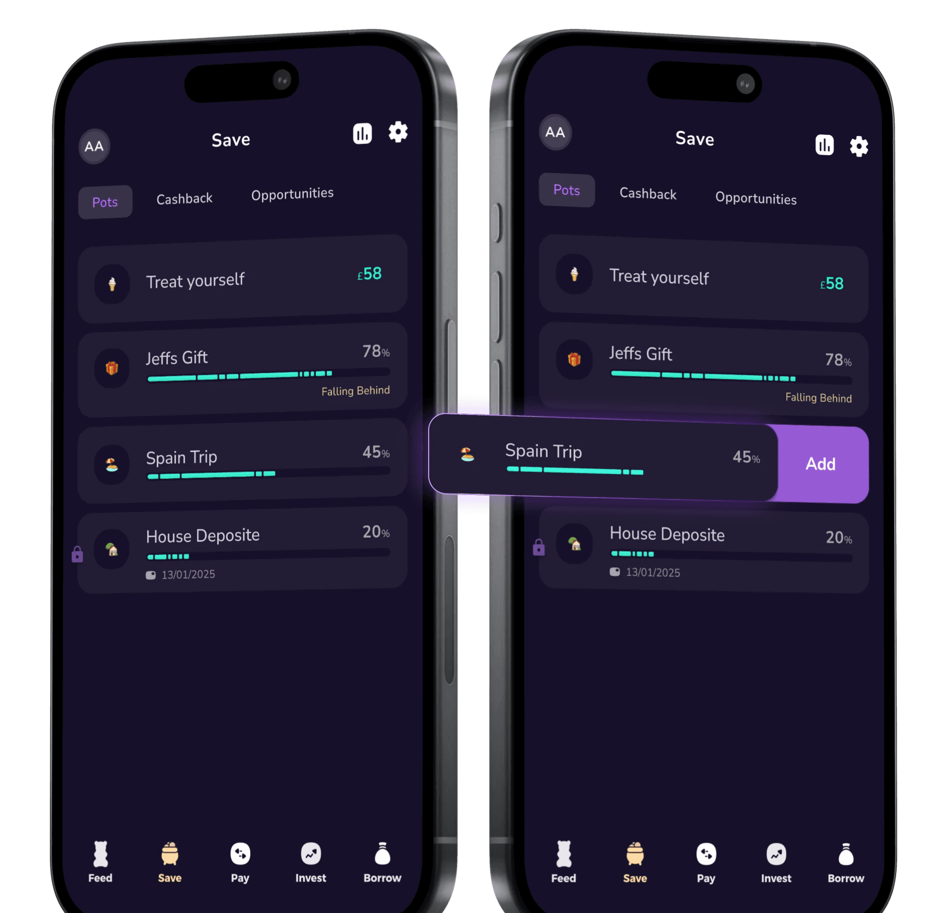 For quick access to add funds to a pod, swipe to the side to reveal this option from the pot list page.