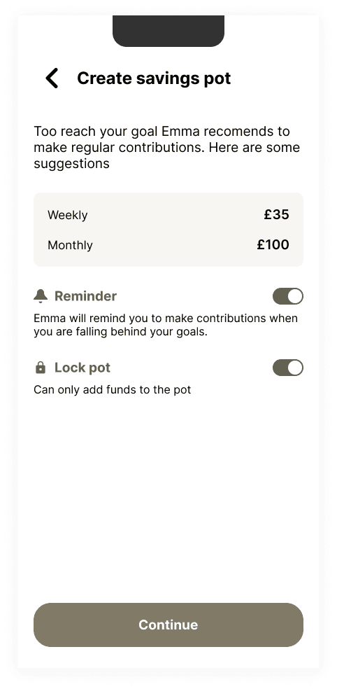 Emma app already has a number of personalised notification option available to keep user on track of their finance. In addition I’ve introduced an option to turn on targeted reminders for individual pots.