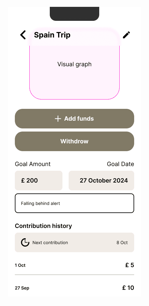 ‘falling behind’: based on goal due date and amount set a rough estimate can be calculated to notify the user if they are on track to hit their goal in response to their contribution history
